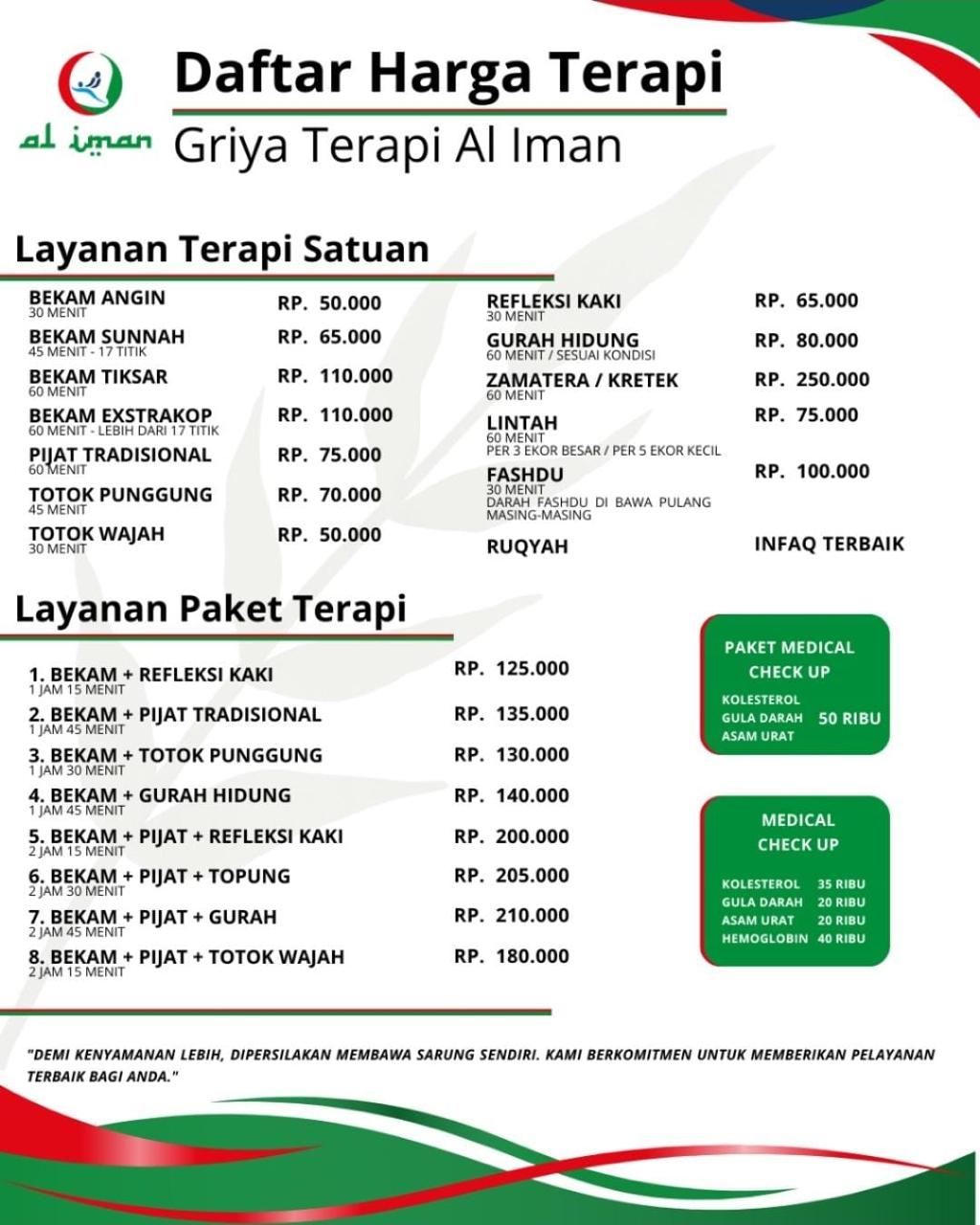 Klinik Bekam Al-Iman merupakan tempat atau klinik yang memberikan pelayanan kesehatan tradisional/komplementer yaitu bekam, bioelektrik, pijat reflex, gurah, ruqyah, dll menggunakan metode yang sesuai dengan ketentuan syariat Islam dan juga sesuai standar medis dengan penanganan dan pelayanan yang profesional dan modern sehingga pasien merasa puas.